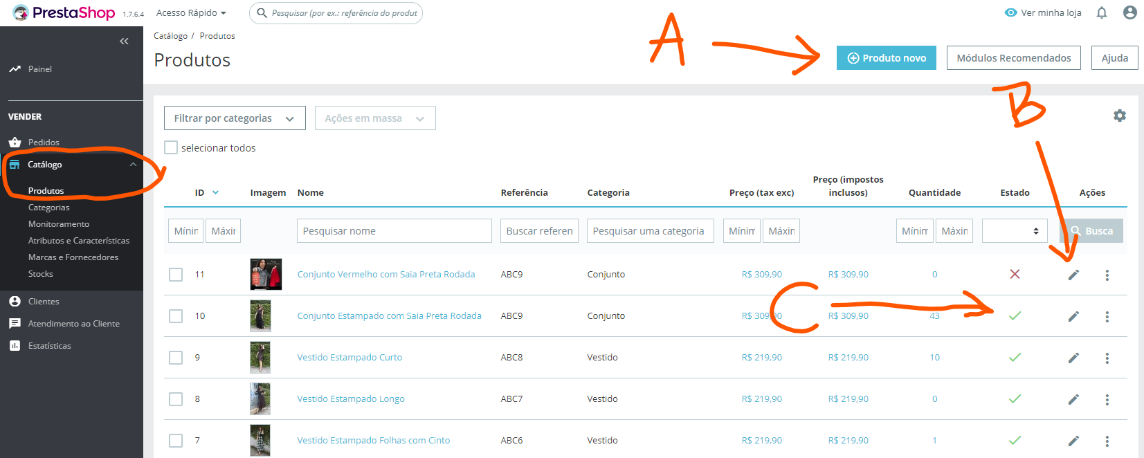 2. No Painel, acesse Catálogo -> Produtos para visualizar a lista de produtos, conforme imagem abaixo:
